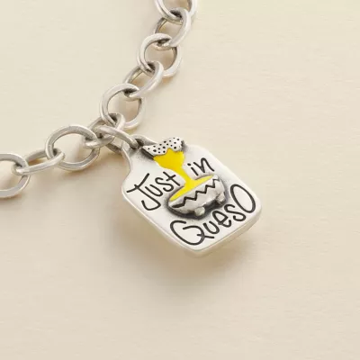 When all else fails, add queso. This whimsical charm celebrates this fiesta favorite with a fun script and yellow “cheese” enameling. Made from sterling silver, this charm can be engraved with a special date, name or message.